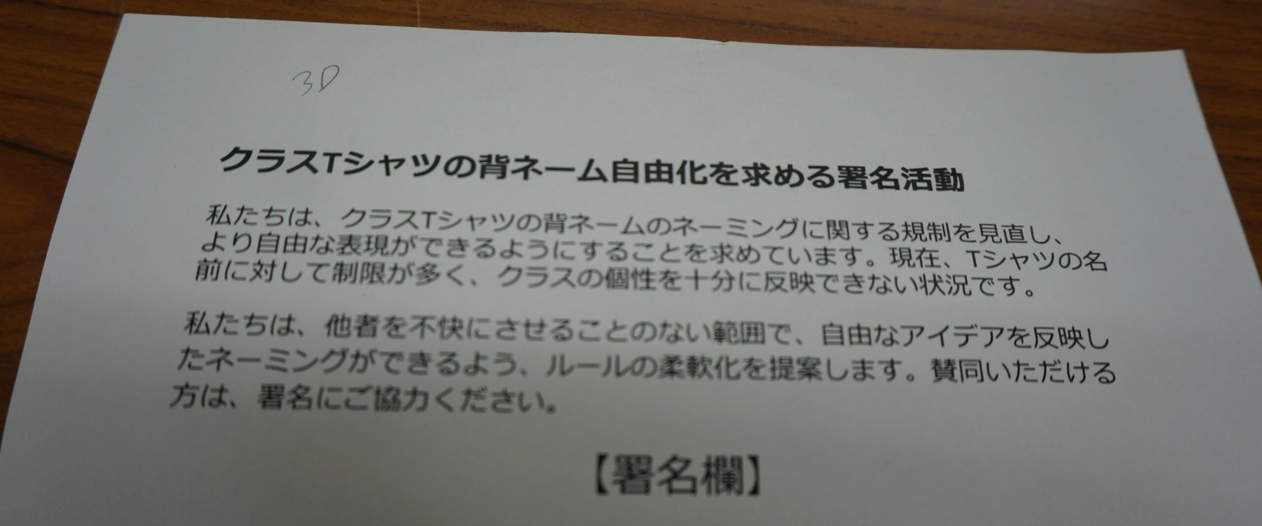 生徒会が動き出したもう一つの課題が、「クラスTシャツの背ネーム問題」だ。学校行事で着用するクラスTシャツの背中に入れる文言について、以前は自由に決めることができた。ニックネームや座右の銘など、本名以外も可能だったという。