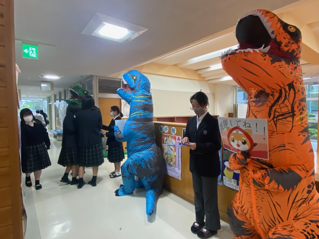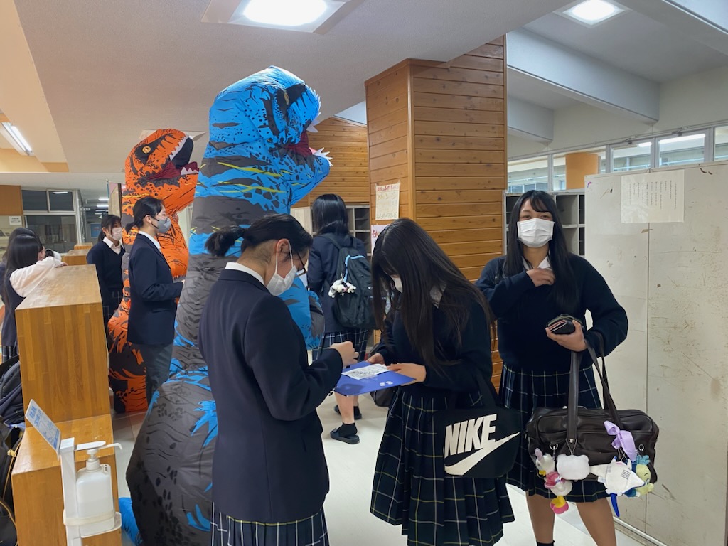 「威圧感のある雰囲気を変えたい」との思いから、渡辺さんが発案したのが「恐竜の着ぐるみ」を活用したあいさつ運動だ。あいさつを呼びかける側が直接声をかけるのではなく、恐竜が「挨拶してね」と書かれたプラカードを持ち、あいさつできた生徒にはスタンプを押す仕組みに変えた。