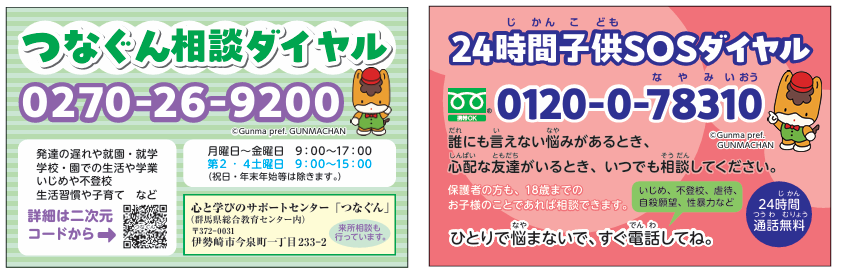 ・つなぐん相談ダイヤル:0270-26-9200(平日午前9時~午後5時、第2・4土曜 午前9時~午後3時)