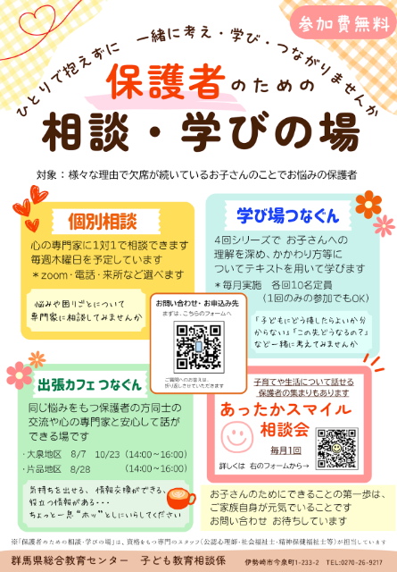 群馬県総合教育センター(伊勢崎市)では、さまざまな理由で欠席が続いている子どものことで悩んでいる保護者を対象に「保護者のための相談・学びの場」を設けている。参加費は無料で、公認心理師や社会福祉士など資格を持つ専門スタッフから助言を受けることもできる。