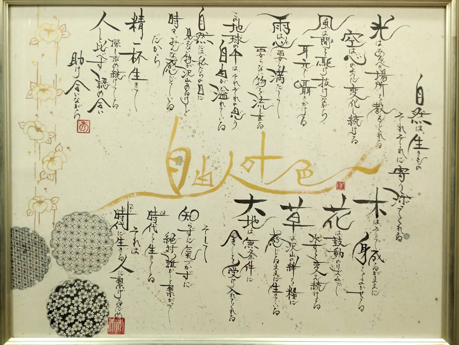 同展では、同会の講師や受講者 約20人が制作した筆文字やモノクロアートなど約80点を展示。両日とも筆文字の無料体験会も予定されている。