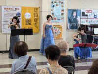 きりゅう市民活動推進ネットワーク・環境づくり委員会が毎月1回開催する「ゆいカフェ」の一環行事。今回は県内外で活躍する3人の女性音楽家ユニット「トリオfff」(ふふふ)が出演。ステージ前では聴衆が集まりすぎて、当初用意した椅子70脚がすぐになくなるほど盛況を博した。
