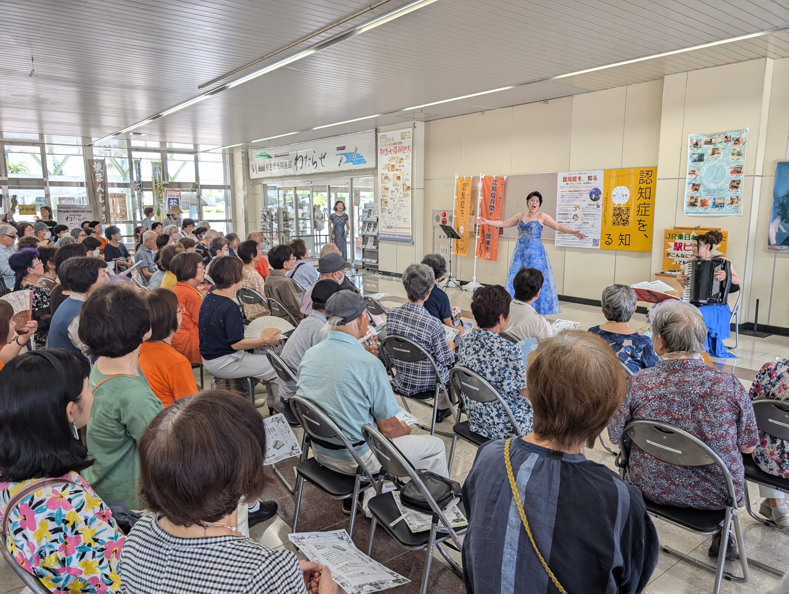 「歌とヴァイオリンとアコーディオンの音楽会」が14日、JR桐生駅構内の駅ピアノ「キリピア」前で開かれ、100人を超す聴衆がプロミュージシャンたちの歌声と演奏に聞き入った。