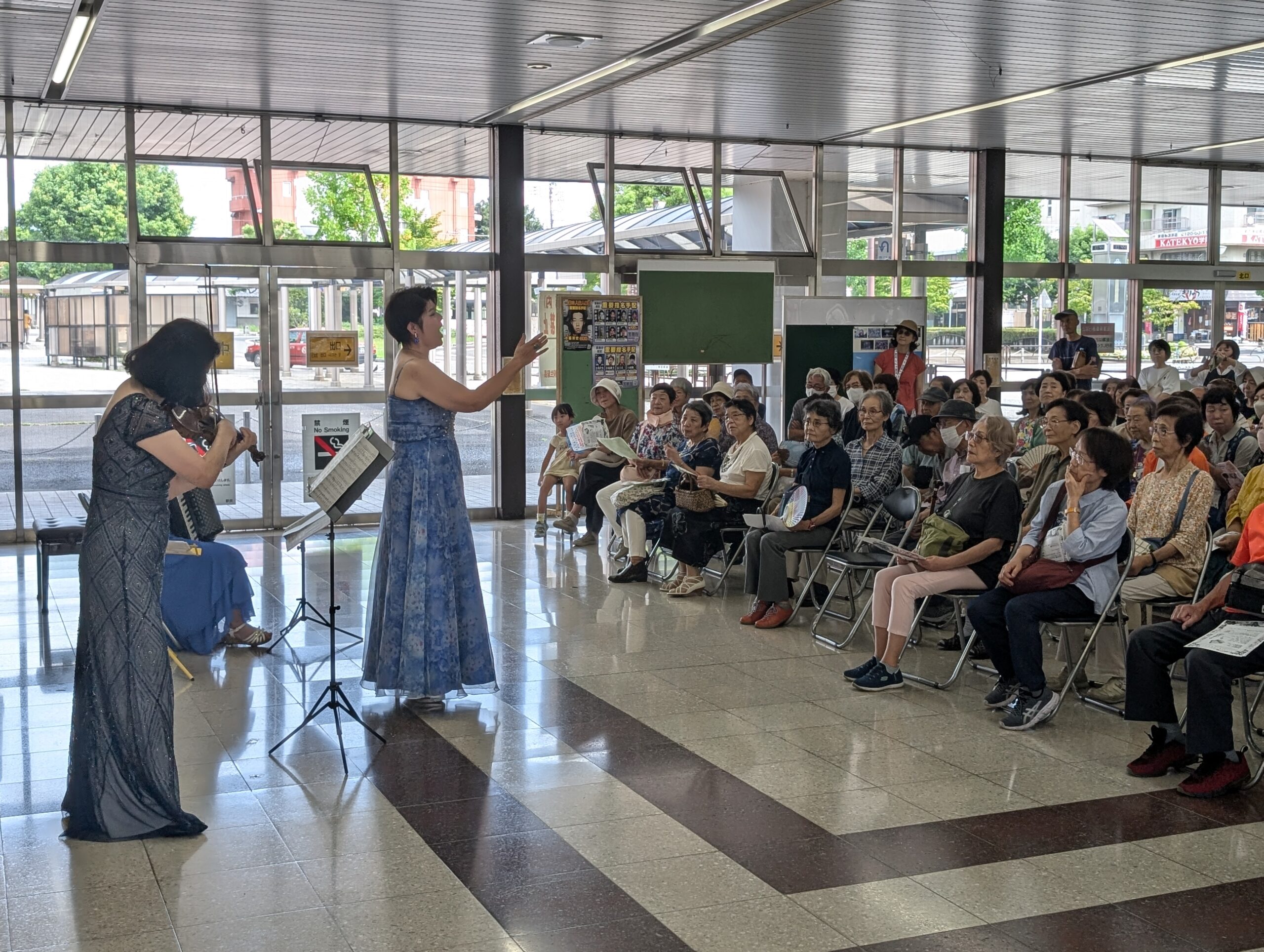 メインボーカルを務めた深津さんは「暑いので、いつもより早い1.5倍速にして歌わなくちゃ。お化粧がくずれちゃう」とユーモアたっぷりに観客の笑いを誘い、カンツォーネの名曲「オー・ソレ・ミオ」を圧巻の歌声で駅構内を美声で響かせた。後半のみんなで歌いましょうのコーナーでは「やさしさに包まれたなら」、天空の城ラピュタの「君をのせて」などを観客とともに合唱した。