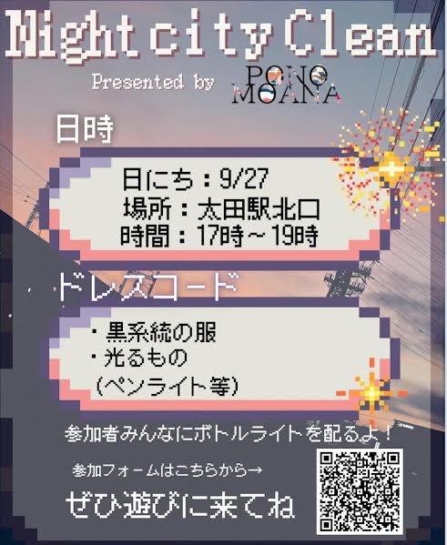 太田市を拠点に活動する高校生環境団体「Pono Moana」(代表・落合颯龍さん)は、9月27日(土)午後5時から7時まで、東武太田駅北口周辺で清掃イベント「ナイトシティクリーン」を実施する。