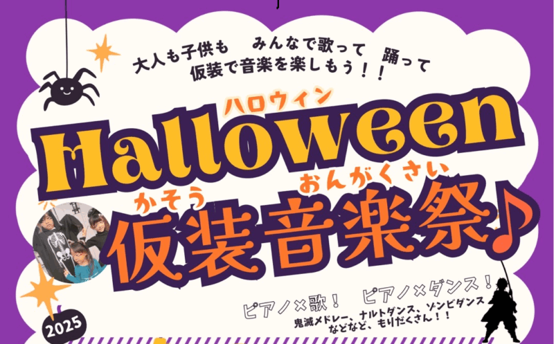 当日は、人気アニメ「鬼滅の刃」メドレーや「ナルトダンス」「ゾンビダンス」など、季節にちなんだ音楽とダンスパフォーマンスが披露される。出演は、育児サークル「桐生新里わんぱくキッズ」やコーラスサークル「nocolor」、aiピアノ教室など。会場では、子どもたちに人気のお菓子のスタンプラリーも行われる予定だ。