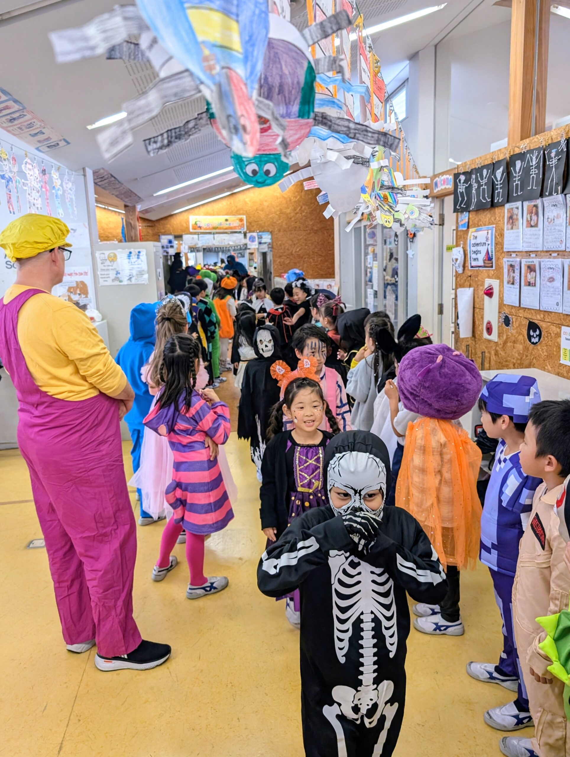 午後1時半からは全児童が参加する「校内ハロウィンパレード」が開始。ゾンビや恐竜、魔女、海賊、ガイコツなどに扮した児童たちが教室から体育館までをクラス順に行進した=写真。
