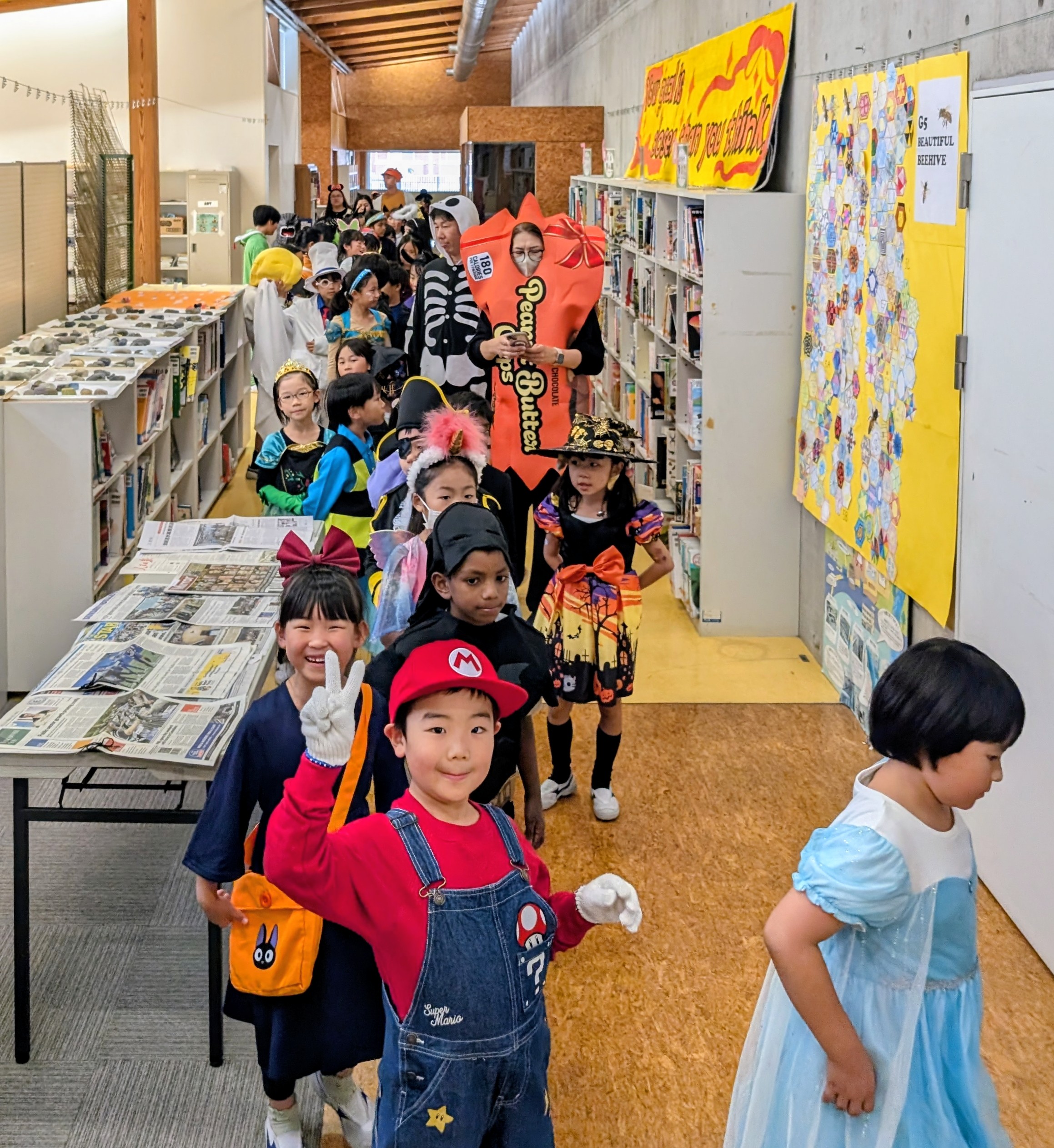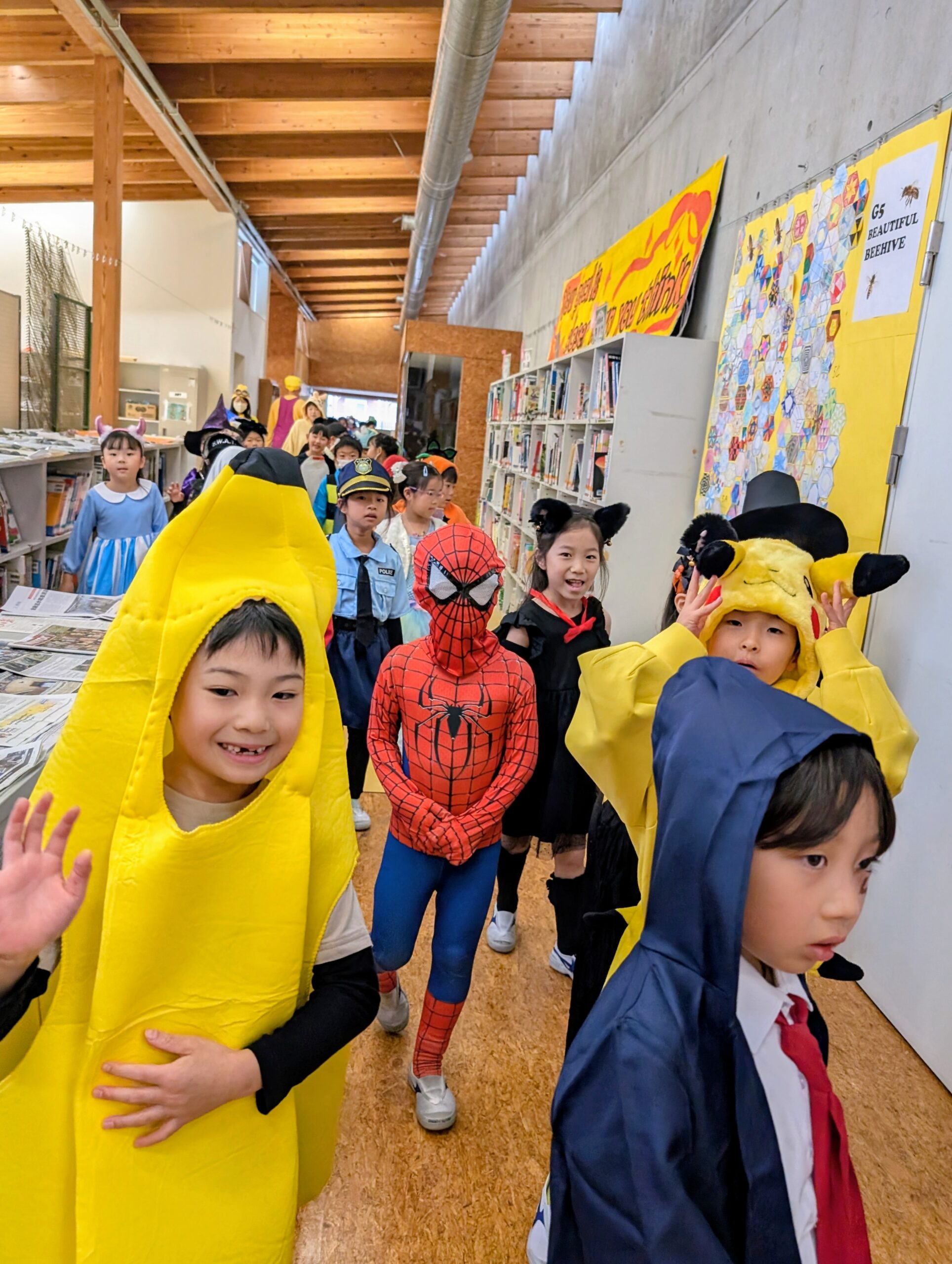 ハロウィンは、毎年10月31日に行われる西洋の悪魔払いの祭りで、同校でも朝の登校から1年~5年生児童507人(6年生は修学旅行中のため欠席)と教員73人が思い思いのコスチュームに身を包み、お祭りムードを盛り上げていた。
