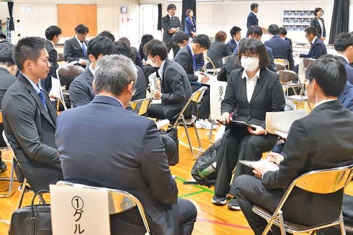【写真】公開授業を見学した教育関係者が各グループに分かれてより良い授業について話し合った(桐生市立南小体育館で)