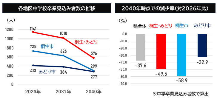 生徒数の減少傾向を見ると、桐生・みどり地区は2040年時点で2026年に比べて49.5%減と、他地区に比べても高い減少率となっている=グラフ=。だが、桐生市とみどり市の状況は対照的で、桐生市単独は58.9%減で県内市部で最大の減少率である一方、みどり市の減少幅は比較的緩やかだ。