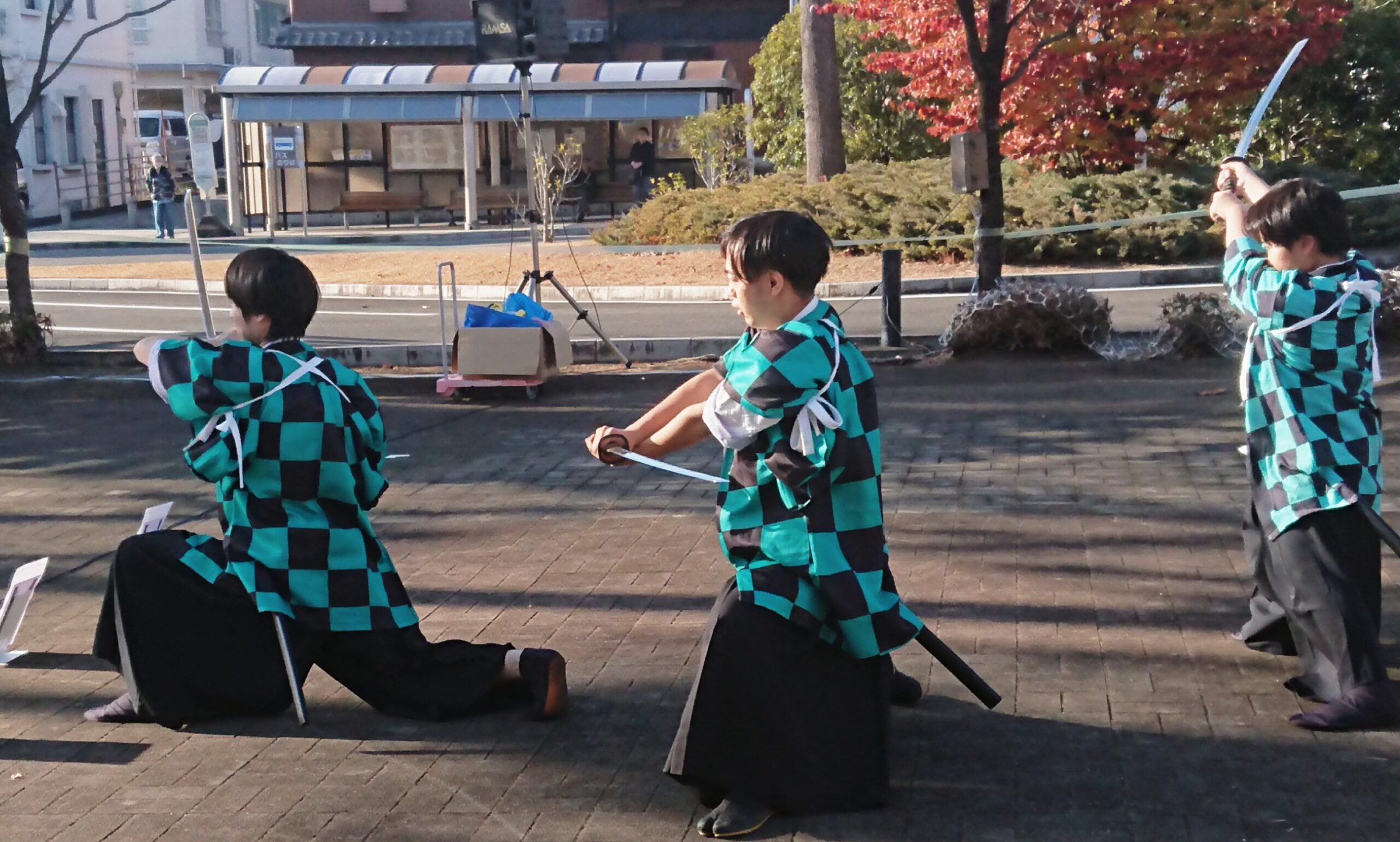武士道と古典芸能の普及を図る太田市の剣詩舞道「眞清流(ませいりゅう)」の剣士3人は人気アニメ「鬼滅の刃」の主人公にちなみ市松模様の羽織姿で居合刀を抜刀、袈裟斬りや突き、上段の構えなど流れるような剣舞を踊った。師範代の眞井建さん(22)は「天候に恵まれて、屋外で気持ちよく踊れることができた」とほほ笑んだ。