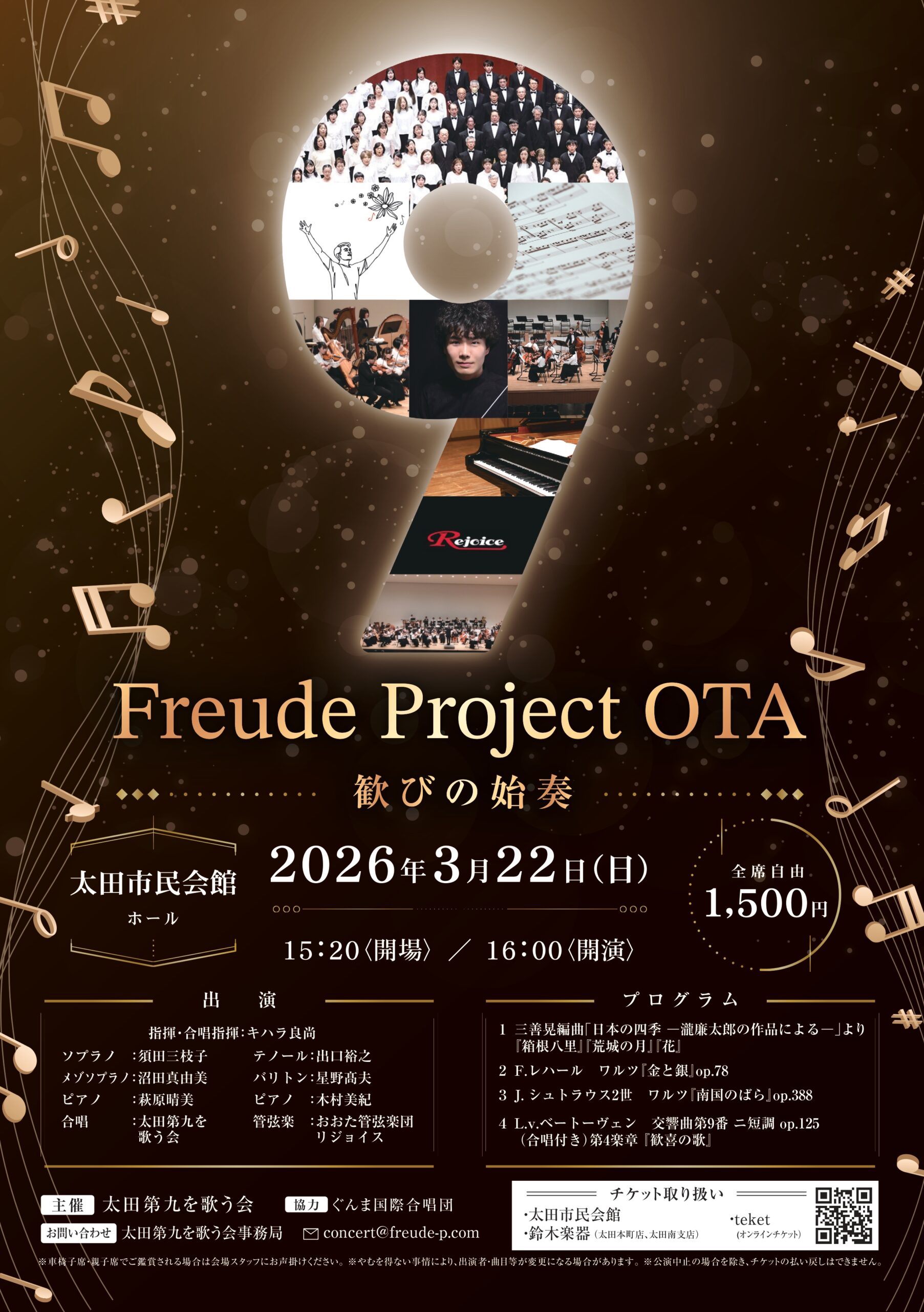 指揮はキハラ良尚氏が務め、合唱は太田第九を歌う会のメンバー240人が担当。10代の参加者も8人加わり、若い世代の声が舞台に彩りを添える。ピアノは萩原晴美氏と木村美紀氏、管弦楽はおおた管弦楽団リジョイスが担当する。