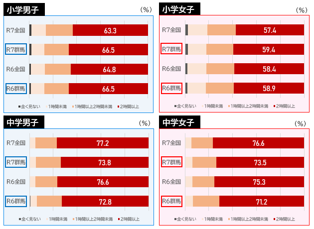 群馬県の中学生では「2時間以上」利用している割合が男女とも全国平均を下回っている。これは、群馬県の中学生の1週間あたりの総運動時間や運動部活動の実施時間が全国平均を大きく上回っていることが影響している可能性がある。部活動による拘束時間が長いことで、帰宅後から就寝までの自由時間が全国より短くなり、結果としてデジタルデバイスに接触する時間が抑えられていると考えられる。