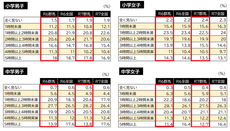 「5時間以上」と回答した割合を見ると、群馬県の小学男子は17.8%と高く、小学女子の13.5%、中学男子の13.8%、中学女子の12.7%と比べても際立っている。一方、全国では中学生の割合が高く、「5時間以上」の利用は男子17.6%、女子16.6%となっている。