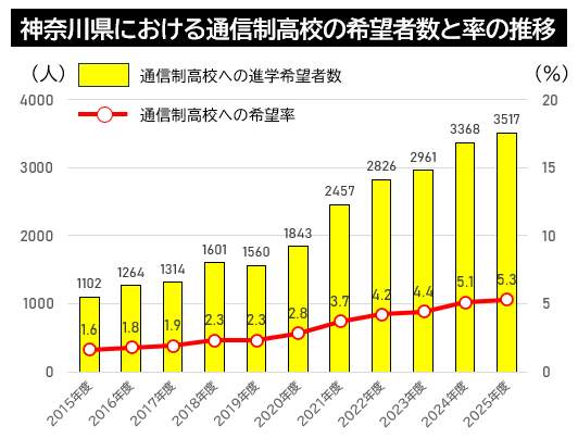 通信制高校の構成比は現時点ではまだ1割に満たないものの、不登校の増加や進路選択の多様化を背景に、今後も拡大していく可能性が高い。実際、長期にわたって通信制高校の進学希望率を調査してきた神奈川県教育委員会の資料では、10年前と比べて希望者が約3倍に増えていることが示されている。