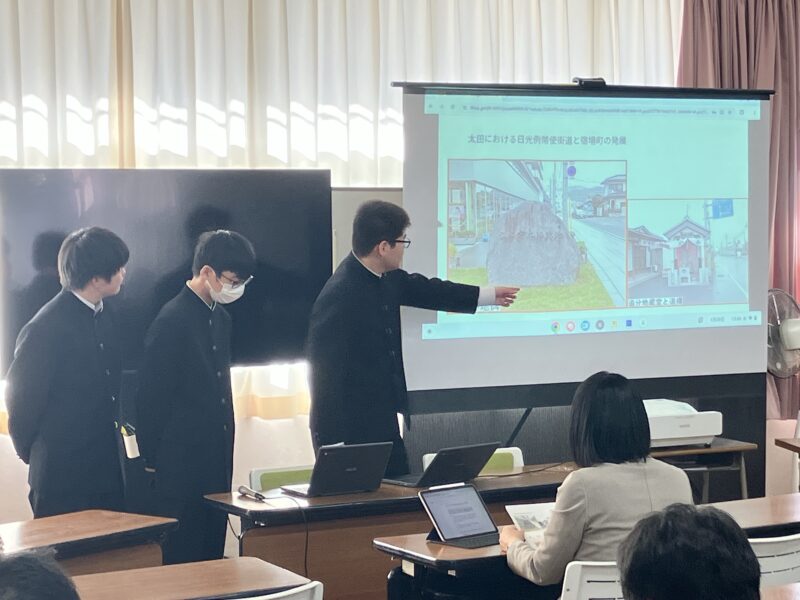 太田東高校の地歴研究部に所属する生徒3人は「太田市の発展と金山城」をテーマに研究成果を発表した。太田市周辺の地形や歴史、産業の変化を軸に、同市がどのように形成され、現在の都市構造に至ったのかを多角的に考察した。