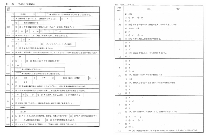 左は2019年度の社会の解答。右は2025年度の解答。比べると記述問題が激減していることが分かる。