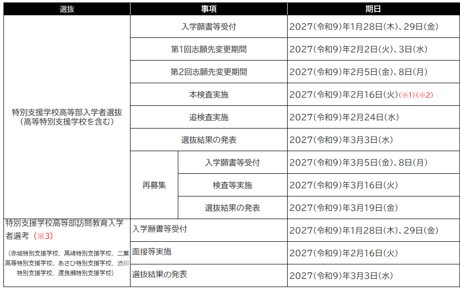 ※1 県立盲学校高等部専攻科入学者選抜は、2027(令和9)年2月17日(水)に実施する。