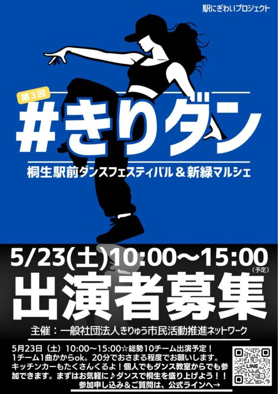 一般社団法人 きりゅう市民活動推進ネットワーク(近藤圭子理事長)は、JR桐生駅前のにぎわい創出を目的としたダンスイベント「第3回『きりダン!』~桐生駅前キッズダンスフェスティバル&マルシェ~」の出演者を募集している。