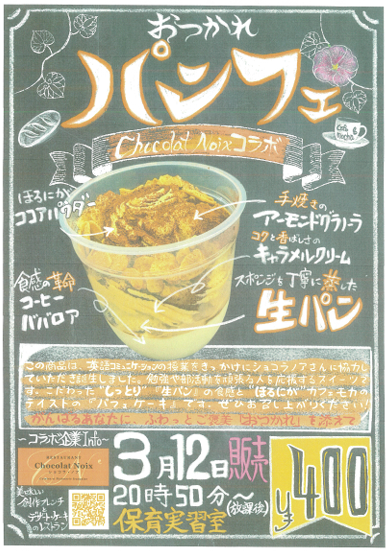 桐生市立商業高校定時制2年の宮沢葵さんは12日、同校で市内の老舗レストラン「ショコラノア」と共同開発したスイーツ「おつかれパンフェ」を販売した。英語の授業で考えたアイデアが実際の商品となったユニークな取り組みで、生徒や教職員から好評を集めた。