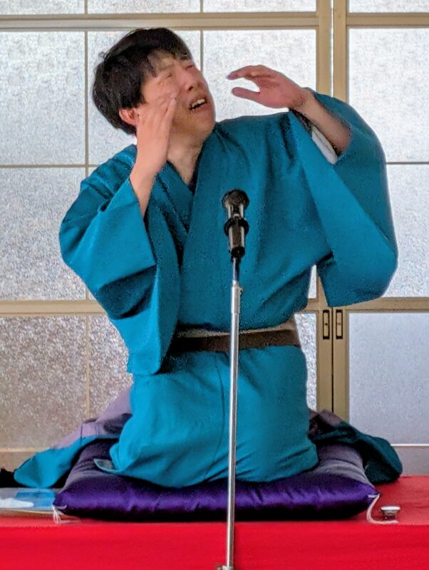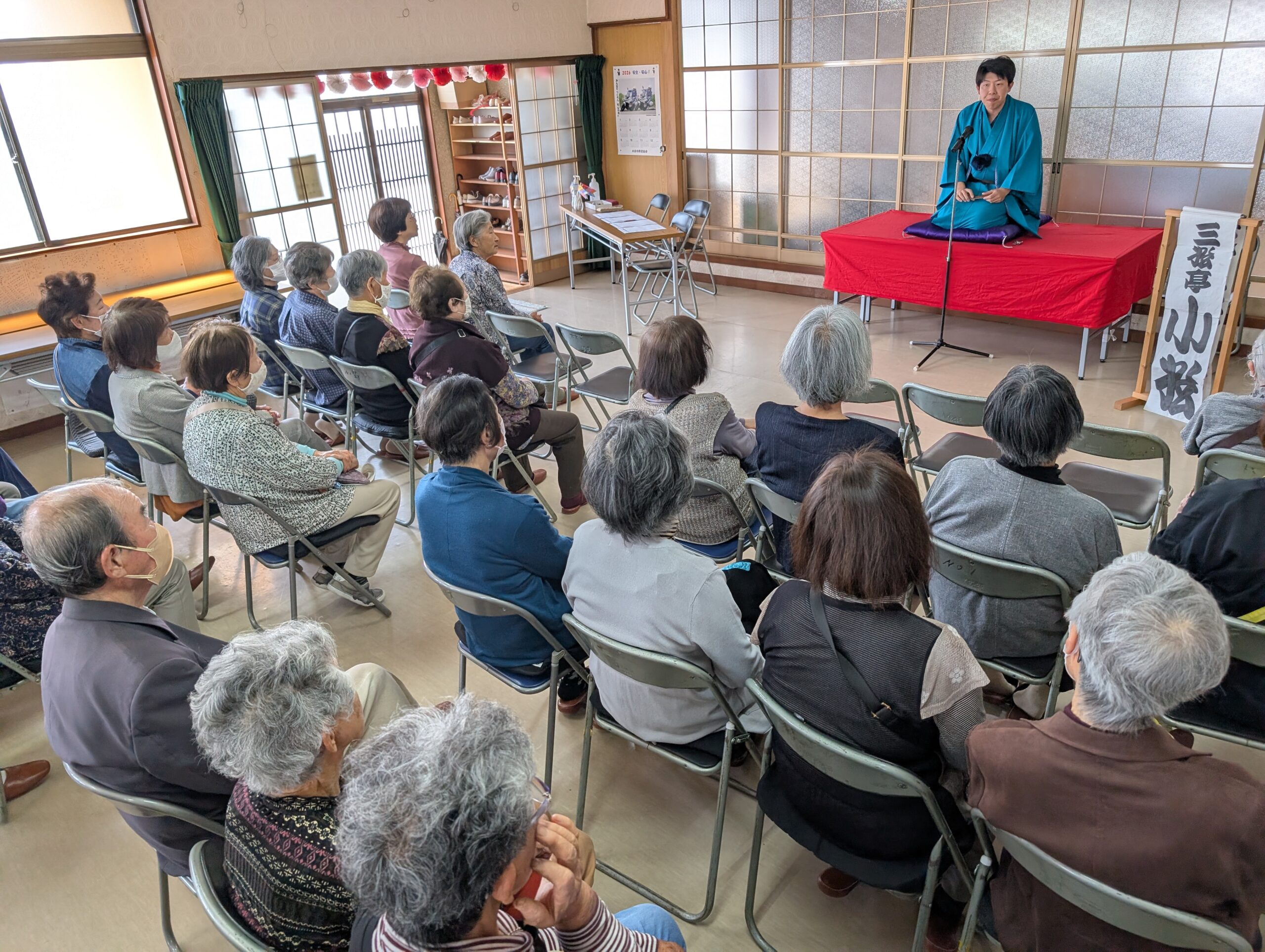 後半には十八番の「寿限無」と「初天神」の二つの演目を披露した。小松さんは「地域のため、落語で恩返しできてうれしい。つまらなくても、無理やり笑ってください」と呼びかけると会場からは大きな笑い声が起きた。