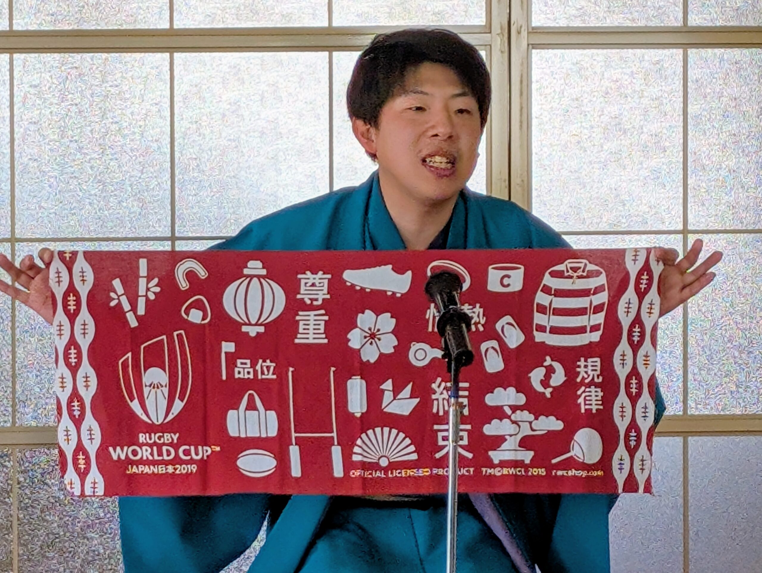 この日は、6種類の手ぬぐいを取り出し、落語の基本テクニックを紹介。