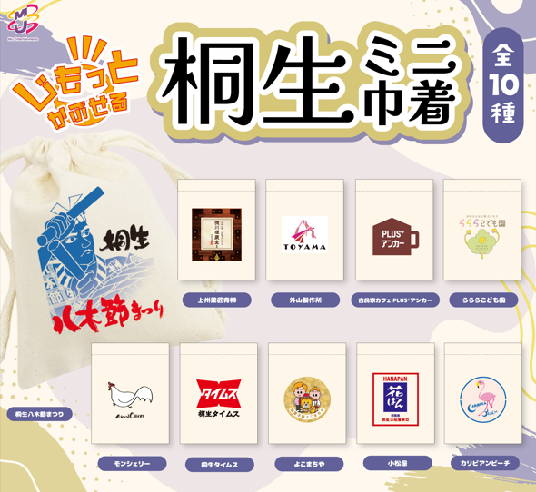 ベイシアグループでアミューズメント事業を手がける株式会社ミュー・エンターテイメント(前橋市亀里町)は、地域の有名看板や企業のロゴをデザインしたカプセルトイ「じもっとかぷせる 桐生ミニ巾着」を、5月1日から桐生市内の駅やコンビニエンスストアなどで順次発売する。
