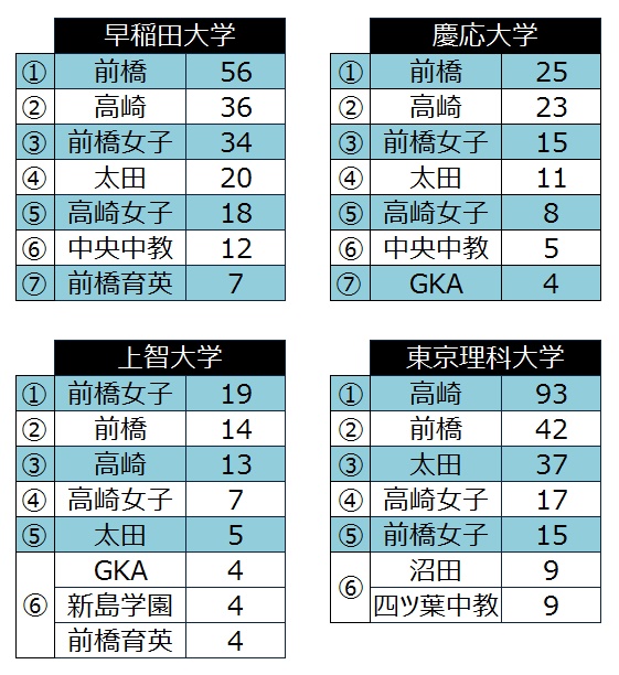 みんなの学校新聞では、各高校が公表している大学別合格者数と大学通信・サンデー毎日・週刊朝日の合同調査を参考に、群馬県内の高校の「早慶上理」(早稲田大学・慶応大学・上智大学・東京理科大学)の合格者数の上位ランキング(上位7位まで)を作成した。